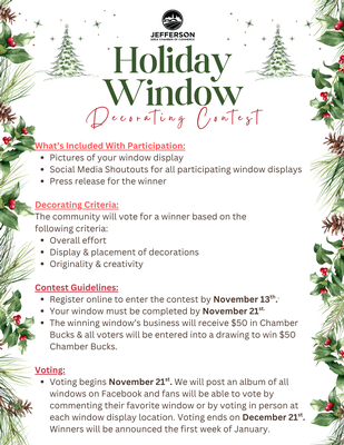 The Jefferson Area Chamber of Commerce invites you to celebrate the season by visiting participating local businesses and casting your vote in our Holiday Window Decorating Contest!