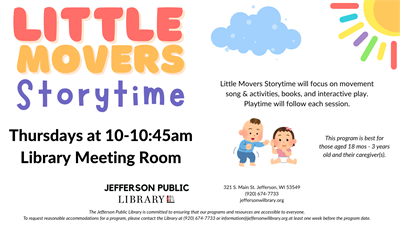 Little Movers Storytime’s goal is to focus on gross motor skills and early literacy through songs & activities, books, and interactive play. Playtime will follow each session. This program will be held in the Library Meeting Room at the Jefferson Public Library.