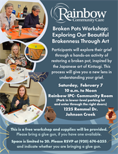 Rainbow Community Care's Bereavement team of Laura Wessels, Hilary Furnish, and Terry Hein will soon offer a free hands-on grief workshop called "Broken Pots." Participants will explore their grief through the activity of restoring a broken pot, inspired by the Japanese art of Kintsugi.